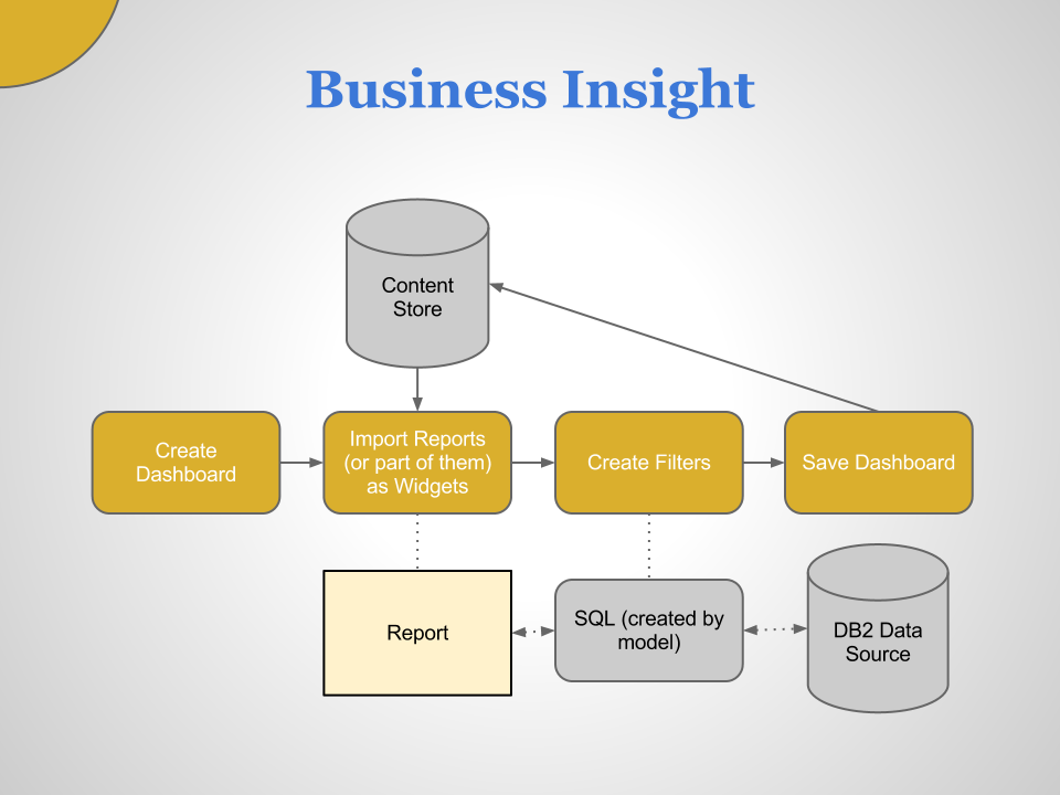 Business Insight is a web-based tool which allows you to use Cognos content and external data sources to interact, analyze and build sophisticated interactive dashboards that facilitate collaborative decision making.