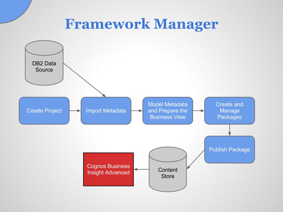 Framework Manager is a desktop application for modeling metadata which provides simplified data access for business reporting and analysis. Models are published as packages and deployed to Cognos.