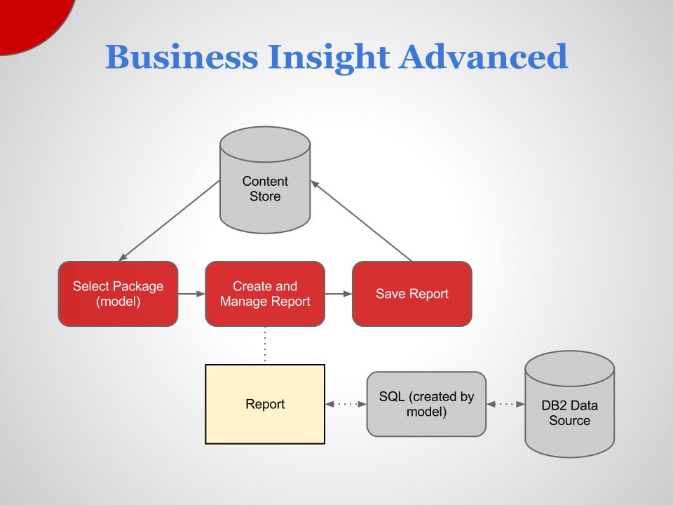 Business Insight Advanced is a web-based tool that allows you to create reports with relational or dimensional data sources, and than show data in lists, crosstabs, and charts.