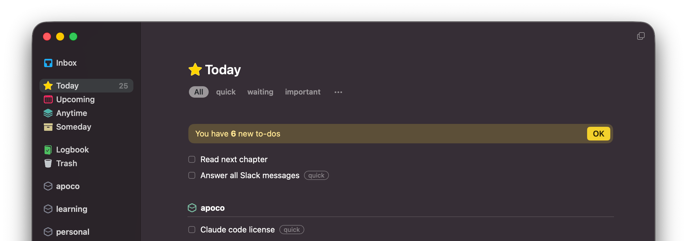 I keep it almost boring: 5 areas, 3 tags (quick, important, waiting), no projects. Just a clean list and a single place my brain can trust.